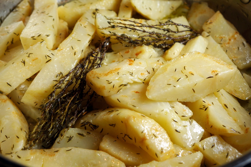 Ovnbagt selleri er godt, men at bage en hel selleri mør i ovnen kan tage over 2½ time og medføre en klimabelastning på niveau med en pose grillpølser – det mest syndige, jeg lige kunne komme i tanke om. Når man deler sellerien i stykker bliver den hurtigere mør, og det er samtidig muligt at tilføre stykkerne lidt ekstra smag og aroma – her med citron og timian. Andre smagsstoffer kan selvfølgelig bruges, men selleriens specielle karakter skal helst ikke overdøves.